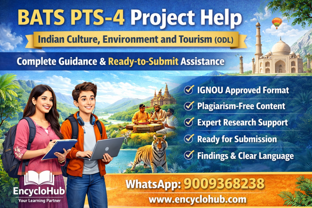 Tourism is not just about travelling from one place to another; it is a deep exploration of culture, environment, heritage, and human connections. India, being one of the most culturally rich and environmentally diverse countries in the world, offers immense scope for tourism studies. For students enrolled in BATS (Bachelor of Arts in Tourism Studies – ODL), the PTS-4 Project on Indian Culture, Environment and Tourism is a crucial academic requirement that integrates theoretical knowledge with practical understanding.